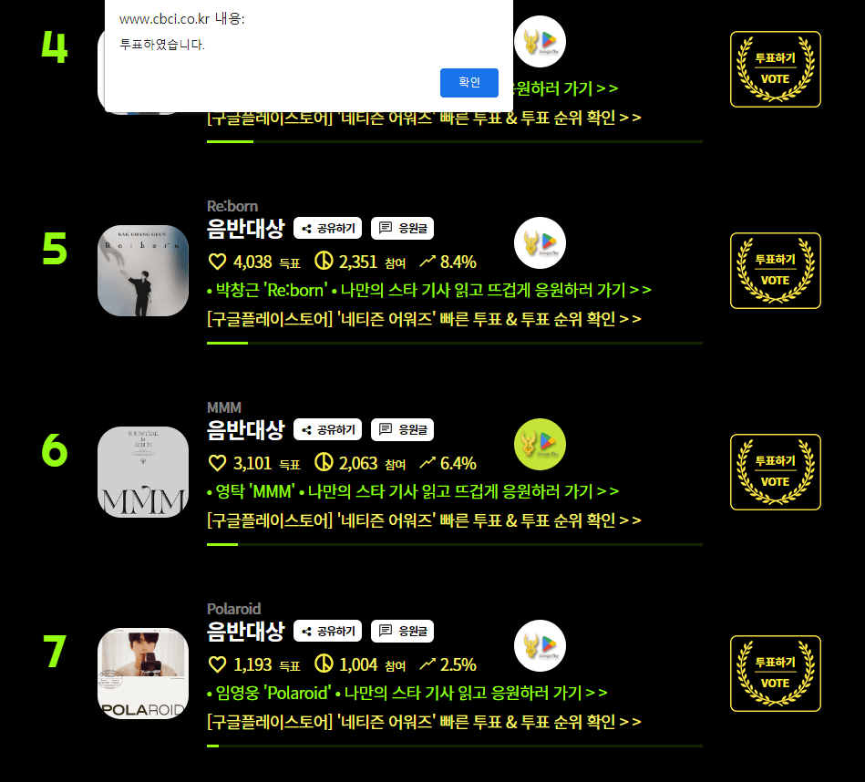 2. 투표 부문 남자 가수상, 음반대상 선택 후 응원하는 가수를 선택해 줍니다.