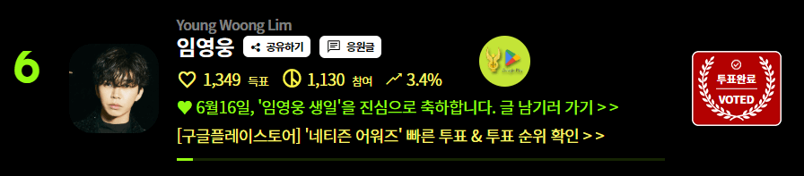 | 6위 | 임영웅 | 1,300명 참여 | 생일축하 응원댓글 남기기 > |