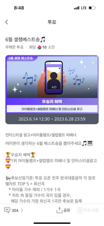 1위에 선정되면 아이돌챔프, 셀럽챔프 앱 띠배너랑 인터스티셜광고 노출된다고 합니다.소재는 여기서 알아서 제작해서 광고 태우는 것 같네요 ㅎㅎ 이것 외에도 6월에는 뮤직비디오 홍보해주는 프로모션도 진행 중이니 같이 투표 참여하면 좋을 거 같아요.