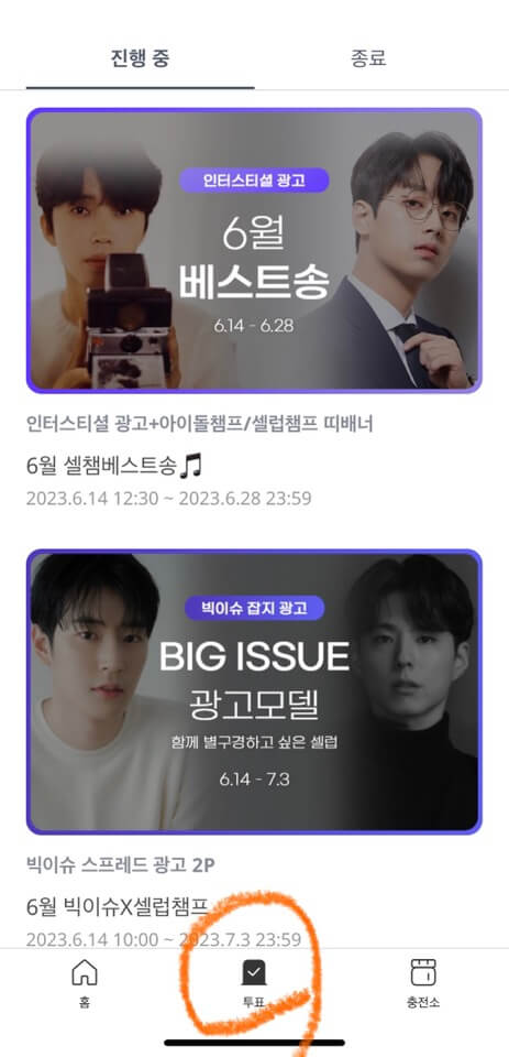 조금 귀찮지만 셀럽챔프 앱에서만 투표할 수 있어요. 앱 설치 후 sns 카카오톡으로 빠르게 회원가입 가능하니까 응원하는 마음을 담아 앱 설치하고 투표해 보시죠~ 으샤으샤