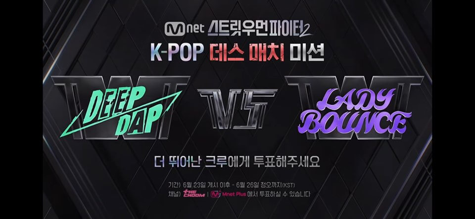 현재 엠넷은 서바이벌 프로그램으로 |글로벌 아이돌 재구성하는 퀸덤2|에 이어서 스트릿 우먼 파이터2가 8월 22일 화요일 저녁 첫방송 예정입니다. 첫방송 앞두고 8크루 라인업과 첫 번째 데스매치 영상이 공개됐어요. 현재 투표 기한이 얼마남지 않아서 영상 보고 투표 서둘러주세요!