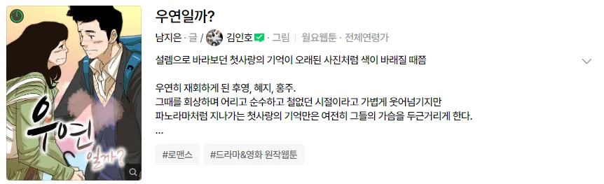 우연일까?는 네이버 웹툰이 원작입니다. 드라마 우연일까는 총 8부작으로 내일이 벌써 최종화입니다. 현재 최종화를 앞두고 후영의 엄마가 미국에서 돌아와서 방해꾼 역할처럼 보이는데요. 남은 회차에 남은 이야기를 다 풀어낼 수 있을지 궁금하네요. 우연일까 웹툰 결말은 함축하면 해피엔딩인데요. 웬툰 결말이 어떻게 나는지 궁금하시다면 네이버 웹툰에서 확인하시길 바랍니다.